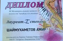 "Агыйдел балкышы" III муниципаль иҗат бәйгесендә 3 класс укучысы Шаймухаметов Әмир I дәрәҗә лауреат булды. Җитәкчесе Варина Т.Р. Котлыйбыз һәм алга таба да зур уңышлар телибез!