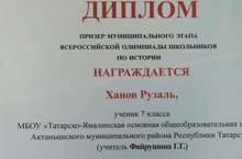 25 ноября состоялась торжественная церемония награждения победителей муниципального этапа Всероссийской олимпиады по истории. Ученик 7 класса нашей школы Ханов Рузаль стал призером. Учитель: Файрушина Г.Г.