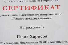 Балаларның техник иҗат республика фестивалендә 7 класс укучысы Харисов Газизгә "Ракетомоделирование" номинациясе буенча сертификат тапшырылды. Җитәкчесе Нургалиев И.И.