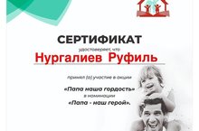 Старательному участнику акции "Папа-наша гордость "Нургалиеву Руфилю пришел сертификат! Поздравляем!