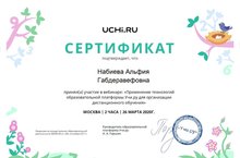 Заместитель директора по воспитательной работе А.Г.Набиева получила Сертификат образовательной платформы "Учи.ру"