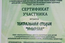 Да здравствует театр! 25.05.2019 Сертификатом за участие в Республиканском конкурсе театральных студий награжден коллектив "Умырзая",под руководством учителя З.М.Гибадуллиной