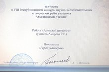 Свидетельство 18.12.2018 Ученице 8 класса Курбановой А.11 декабря было выдано свидетельство за участие в VIII Республиканском конкурсе научно-исследовательских и творческих работ "Аксаковские чтения" за работу "Аленький цветочек" .(Руководитель Р.С.Амирова)