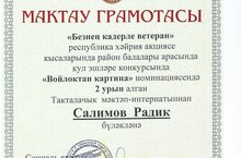 Ученик 8 класса Салимов Радик получил 2 место в районе, в рамках Республиканской благотворительной акции "Наш дорогой ветеран"со своим творческим проектом.(Руководитель -учитель С.С.Билалова)