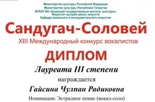 Xlll Халыкара "Сандугач-Соловей" вокалистлар конкурсында катнашып, укучыбыз Гайсина Чулпан 3 нче дәрәҗә лауреат булды. Котлыйбыз!