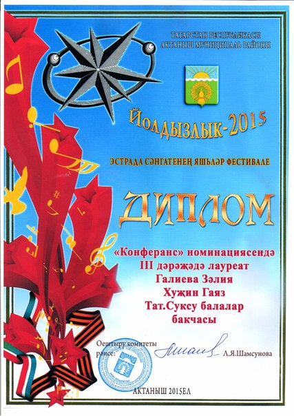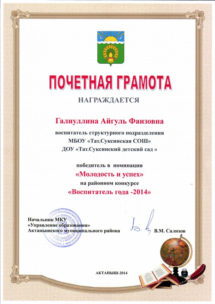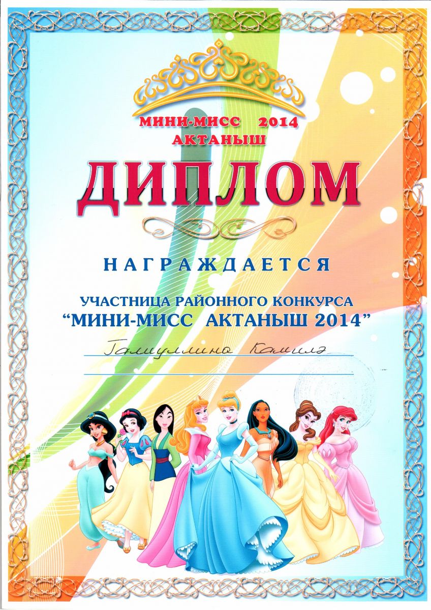 Диплом участницы районного конкурса "Мини-мисс Актаныш - 2014" Галиуллина Камилла