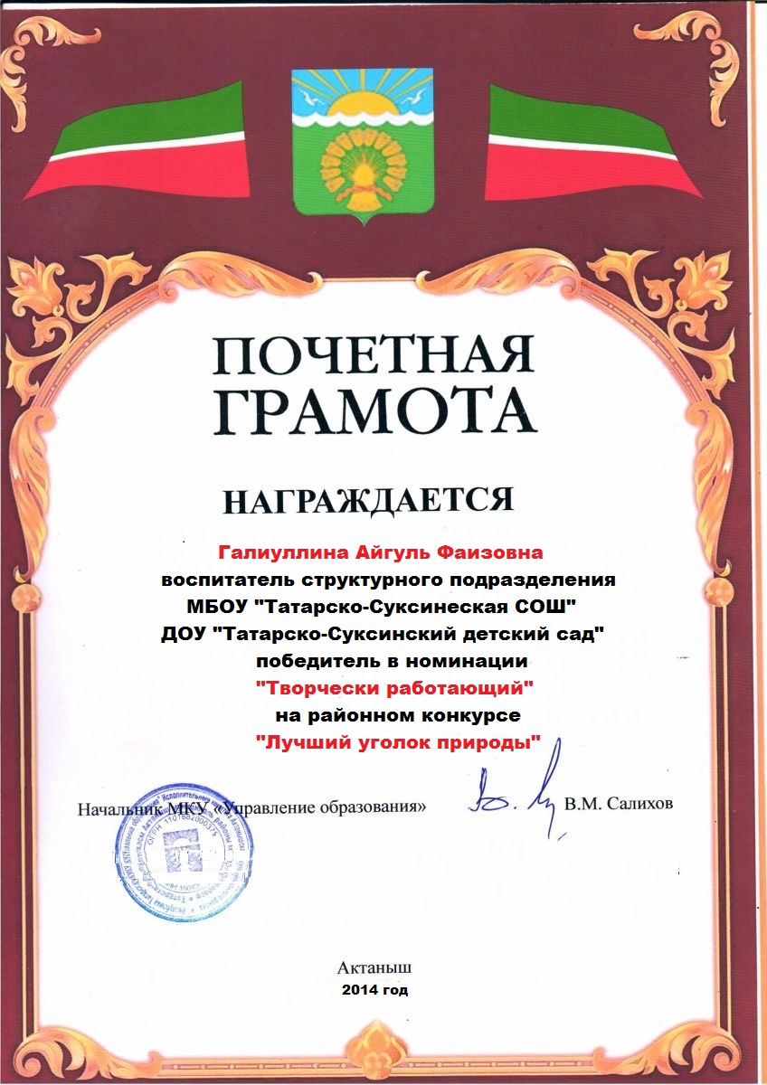 Почетная грамота в номинации "Творчески работающий" на районном конкурсе "Лучший уголок природы"