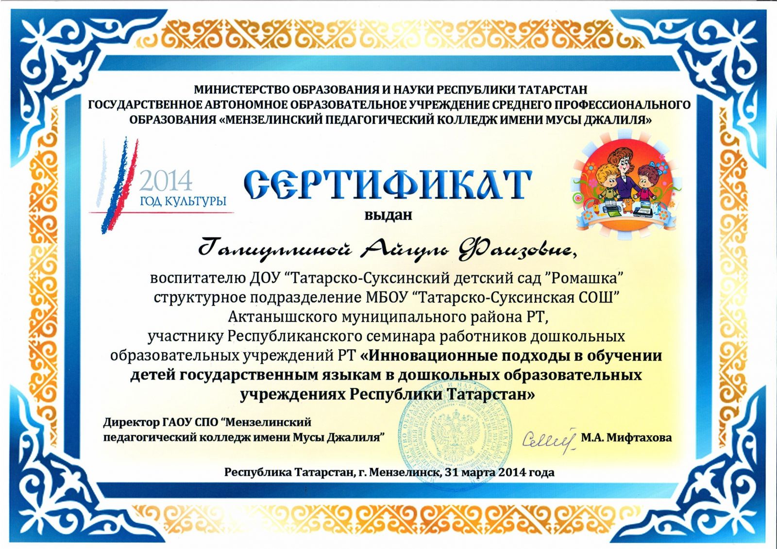 Сертификат участника Республиканского семинара работников ДОУ РТ, воспитатель Бикмухаметова Г.К.