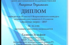 Iнче Бөтенроссия "Золотое перо"-2017 дистанцион сочинениеләр конкурсын 30.01.2017 ЦДПУ "АкадемияПедагогики" үткәргән Iнче Бөтенроссия "Золотое перо"-2017 дистанцион сочинениеләр конкурсында 2нче урынны яулаган өчен 9нчы класс укучысы Галиева Зөлфия диплом белән бүләкләнде(укытучысы Сабирова Г.Ф).