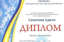 Татарстан Республикасы мәгариф һәм фән министрлыгы һәм Татарстан Республикасы язучылар берлеге оештырган "Илһам" бөтенроссия яшь язучылар бәйгесендә катнашып, безнең мәктәпнең 8 нче класс укучысы Саматова Адилә Айрат кызы ДИПЛОМ белән бүләкләнде.