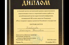 Татар теле һәм әдәбияты укытучысы Хабирова Мәйсәрә конференциядә чыгыш ясады һәм диплом белән бүләкләнде.