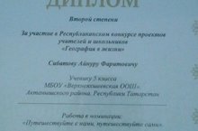 Сибатов Айнур награждается Дипломом второй степени за участие в Республиканском конкурсе проектов учителей и школьников "География в жизни" работа в номинации "Путешествуйте с нами, путешествуйте сами".Поздравляем!