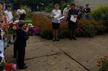 После символического первого звонка, который дали первоклассница в сопровождении выпускника, нового учебного года, собравшиеся прошли в здание школы, где их ждал первый урок, посвященный Уроку Мира.