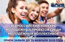 Всероссийский конкурс молодежных проектов среди молодежных коллективов 09.02.2018 Уважаемые посетители сайта!!! До 25 февраля продолжается прием заявок на Всероссийский конкурс молодежных проектов среди молодежных коллективов. Информация о грантовых конкурсах Росмолодежи размещена на сайте:http://rosmolgrant.ru/. Дата проведения: 25.01.2018 - 25.02.2018. Сумма гранта: 2 000 000 руб.Общая сумма: 300 млн. руб. (максимальный размер гранта до 2 000 000 руб.)►Подробнее