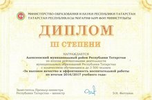 Диплом 3 степени «За высокое качество и эффективность воспитательной работы по итогам 2016/2017 учебного года» 14.08.2017 10 августа в Муслюмово состоялось секционное заседание августовского совещания работников образования и науки на тему «Дополнительное образование детей-пространство успешной социализации личности».