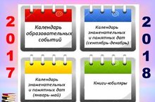 Календарь образовательных событий на 2017–2018 учебный год 04.09.2017 Министерством образования и науки Российской Федерации подготовлен календарь образовательных событий на 2017–2018 учебный год, приуроченных к государственным и национальным праздникам России, памятным датам и событиям российской истории и культуры.