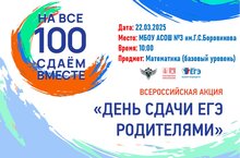 Уважаемые родители! МКУ «Отдел образования Алексеевского муниципального района РТ» приглашает Вас принять участие во Всероссийской акции «Единый день сдачи ЕГЭ родителями».Мероприятие будет проходить 22 марта 2025 года на базе МБОУ АСОШ №3 им.Г.С.Боровикова.Начало:10:00 часов.Всероссийская акция «Сдаем вместе. День сдачи ЕГЭ родителями», инициатором которой является Федеральная служба по надзору в сфере образования и науки, в 2025 году проходит в девятый раз.При подготовке к ЕГЭ огромное значение имеют ....