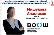 Мишукова Анастасия Фёдоровна, обучающаяся 9 класса Алексеевской школы №1 имени А.А.Малафеевой, стала призёром регионального этапа всероссийской олимпиады школьников по физической культуре, подготовкой занимается учитель Черевов Артём Дмитриевич.Поздравляем и желаем им дальнейших успехов!