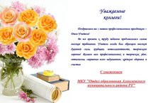 С днем учителя!!! 05.10.2020 Уважаемые учителя, работники образовательных организаций, ветераны педагогического труда!От всей души поздравляем вас с нашим профессиональным праздником, который стал поистине всенародным, потому что его отмечают, помнят и любят во многих семьях. Все профессии важны, но одна из них самая уважаемая и почётная, совершенно особенная, добрая, но необыкновенно ответственная- это Учитель. Ежедневно мы берем за руку и ведем в школу самое дорогое, что у нас есть в жизни и доверяем свое сокровище именно ему.Учитель - это очень важный человек! Спросите у любого родителя, что он считает главным элементом обучения своего ребенка, и он ответит: хорошие педагоги.Быть учителем можно только по призванию. Для большинства из вас школа– это не место работы, а второй дом. Ваша профессия несравнима ни с одной другой- в ваших руках судьба поколений. Своей самоотверженностью, неустанным трудом и постоянным творческим поиском вы закладываете будущие наши свершения и основы завтрашнего дня.И не случайно, что где бы мы не работали, сколько бы нам не было лет, в какой бы уголок Земли нас не забросила судьба, любимый учитель всегда в нашем сердце. Именно он сыграл огромную роль в жизни многих из нас, помог определиться с будущей профессией и открыл наши способности и таланты. Дорогие наши учителя, ветераны педагогического труда! Низкий вам поклон за молодость души и мудрость слова, за то, что вы передаете свои бесценные опыт и знания молодым педагогам, являясь для них примером и образцом глубокой верности своему призванию.Уважаемые педагоги, спасибо вам за ваш профессионализм, терпение, за дух творчества, который вы несете в классы, способность понимать детские радости и переживания, неуклонное желание идти в ногу со временем, за вашу мудрость, активность, душевное тепло и любовь, которые вы дарите своим воспитанникам. Пусть каждый новый день приносит вам только позитивные эмоции и удовлетворение от вашего благородного труда!