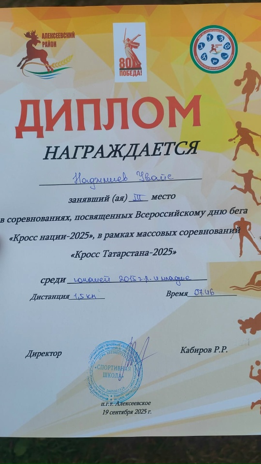 19 сентября на лыжной базе прошли соревнования "Кросс Нации" Наджмиев Увайс занял 3 место среди учащихся 2015 и младше.