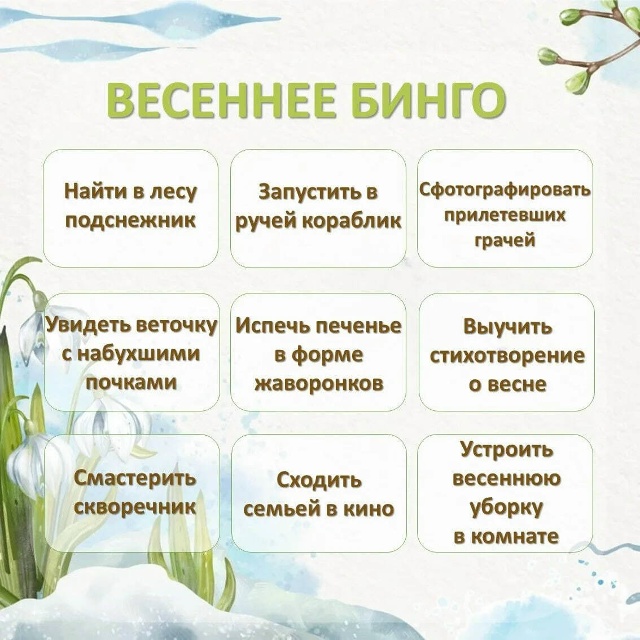 Чтобы не пропустить волшебство перемен и запомнить весну во всех её проявлениях, подготовили для вас список заданий. Выполняйте их всей семьей