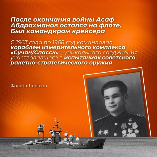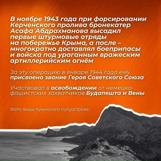 Сезне Татарстаннан Бөек Ватан сугышы геройлары язмышы белән таныштыруны дәвам итәбез Бүген карточкаларда - тормышын флот белән бәйләгән Асаф Абдрахманов тарихы. Сугыш елларында ул бронекатер белән командалык итә, Кырымны фашист илбасарларыннан азат итү буенча операциянең уңышын тәэмин итә. Бу операция өчен 1944 елның гыйнварында аңа Советлар Союзы Герое исеме бирелә #Победа80 #Героитатарстан