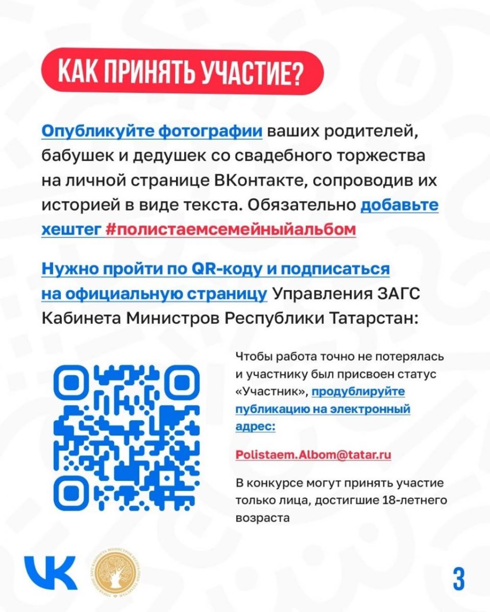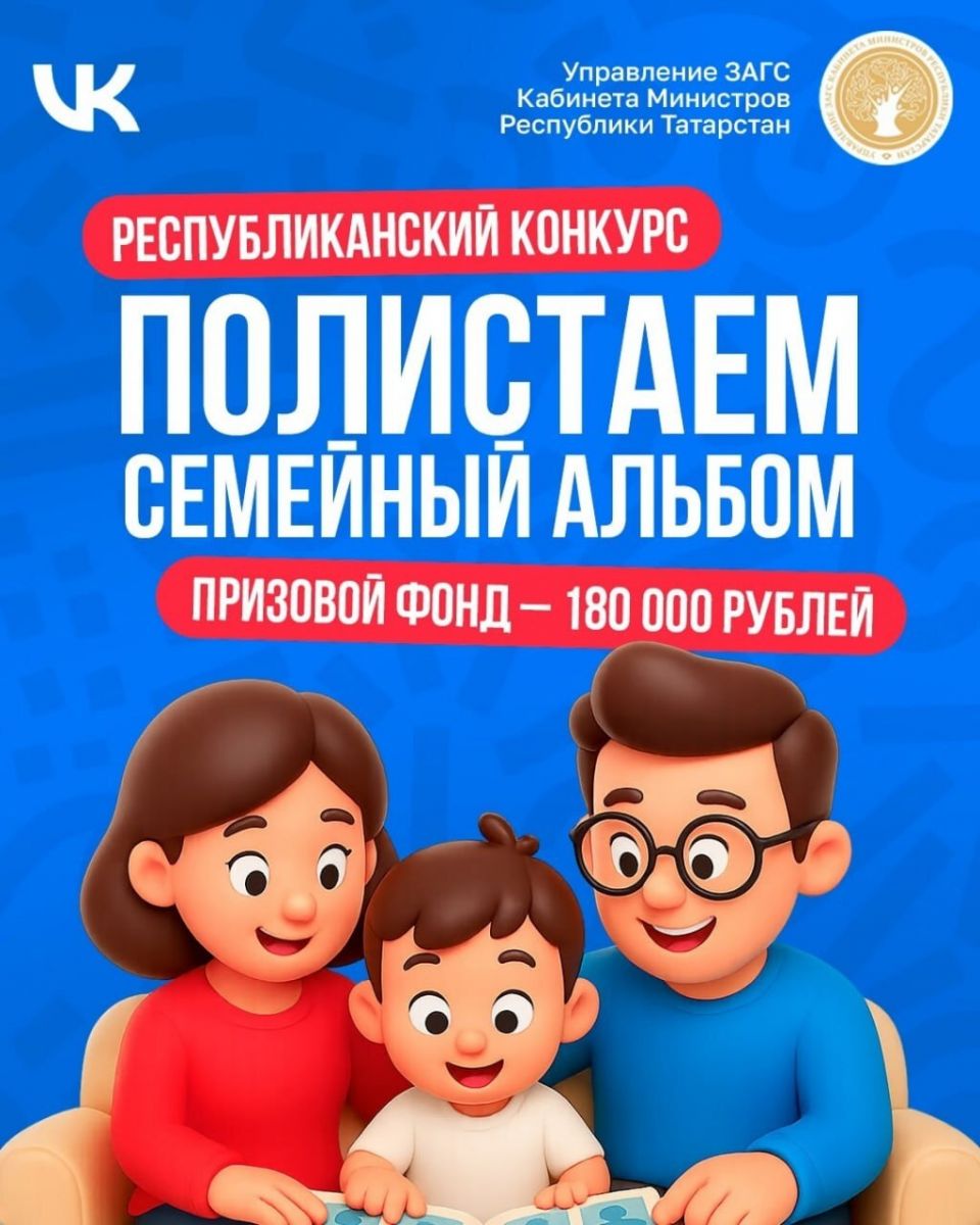 Гаиләгез турында җылы хатирәләрегез белән уртаклашыгыз – «Гаилә альбомы Актарабыз» республика конкурсында катнашыгыз ТР рәисе Рөстәм Миңнеханов әйткәнчә:»Татарстан Республикасы ныклы гаилә традицияләре белән дан тота, алар буыннан-буынга, өлкәннәрдән кечеләргә ярату һәм хөрмәт белән тапшырыла". Әйдәгез, бергәләп буыннарны берләштерүче, бер-берсен балачактан ук сакларга өйрәтүче гаилә кыйммәтләре турында сөйлик. Конкурста катнашу өчен ата-аналарның яисә ди-бабайларның туйларыннан фотолар бастырып чыгарырга һәм аларның тарихын сөйләргә кирәк. Под нечкәлекләре һәм катнашу кагыйдәләре – карточкаларда. Конкурс турындагы нигезләмәне сез ТР Министрлар Кабинеты ЗАГСының рәсми сайтында табарсыз. #полистаемейный альбом