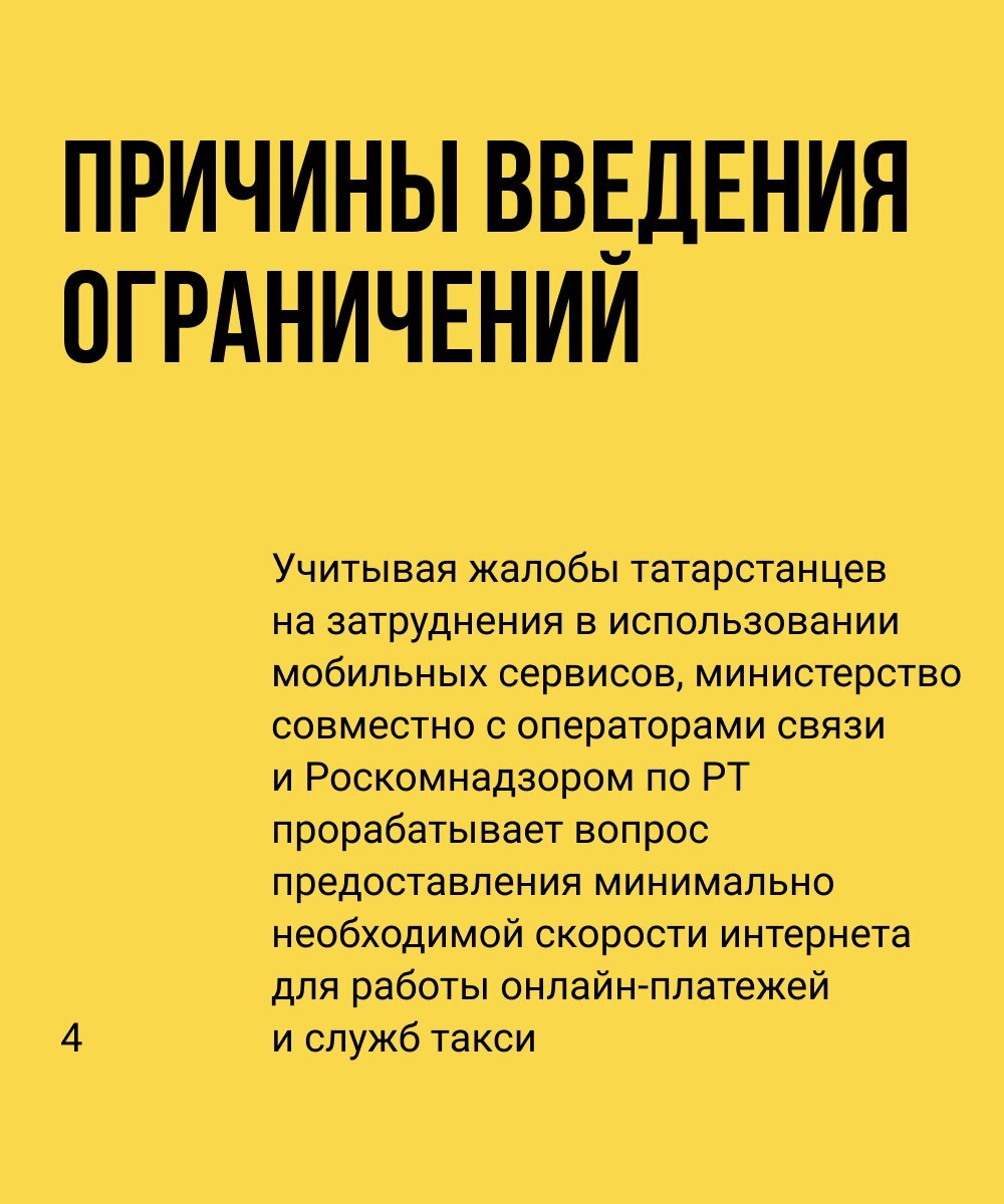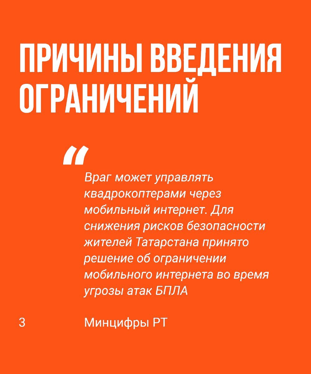 Шуны белү мөһим: мобиль Интернетны вакытлыча чикләү-ул куркынычсызлык чарасы Исегезгә төшерәбез, «пилотсыз куркыныч» режимы вакытында республикада мобиль Интернетка керү вакытлыча чикләнергә мөмкин. Бу дошман пилотсыз очкычлары белән көрәшүнең нәтиҗәле чараларының берсе. Мөмкин булганча стационар Wi-Fi кулланыгыз. Карточкаларда-Татарстан цифрлар министрлыгыннан аңлатмалар. Аларны якыннарыгыз һәм дусларыгыз белән бүлешегез.