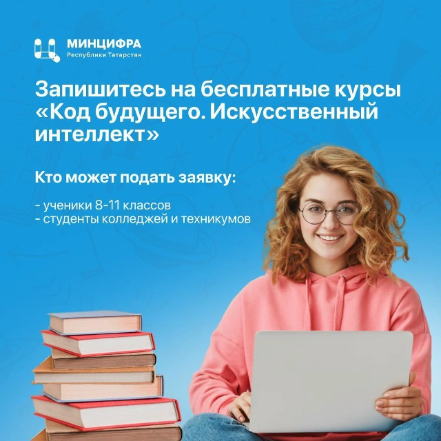Җәйне файдалы үткәрегез: укучылар өчен ясалма интеллектны өйрәнү буенча бушлай курс эшли башлады 8-11 сыйныф укучылары " киләчәк коды. Ясалма интеллект". Бу яи, машина өйрәтү һәм Python программалаштыру теле Нигезләре белән таныштыра торган онлайн-курс – хәтта элегрәк бу темалар белән очрашмаганнарны да. Програм программа нәрсәне үз эченә ала: - Әйдәп баручы цифрлы платформалардан 6 курс: МФТИ, Яндекс, 1Т, Цифриум һәм программистлар мәктәбе; - 54 академик сәгать уңайлы онлайн-форматта укыту; - Программаны үтүгә 4 ай. Проектта катнашу-бушлай, Дәүләт хезмәтләре порталында гариза бирү дә җитә: www.gosuslugi.ru/ai. Проект «мәгълүматлар икътисады»милли проекты кысаларында гамәлгә ашырыла. Алынган белемнәр ИТ-юнәлешләргә кергәндә ярдәм итәчәк һәм цифрлы карьерага бер адым булачак.