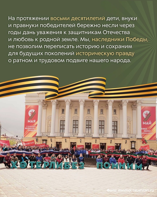 Кадерле язылучылар! Сезне Бөек Җиңүнең 80 еллыгы белән котлыйбыз! Без фронтта һәм тылда күптән көтелгән Җиңүне якынайткан бабаларыбызның, бабаларыбызның, ти-бабаларыбызның батырлыкларын хәтерлибез һәм хөрмәт итәбез. Аларның фидакарьлеге ватанпәрвәрлек һәм Ватанны ярату үрнәге булсын, ә безнең йөрәкләрдә һәрвакыт җиңүчеләр буынына рәхмәт хисләре яшәсен. Күптән көтелгән бу дата белән татарстанлыларны Республика рәисе Рөстәм Миңнеханов котлады. Карточкаларда аның мөрәҗәгатеннән цитаталар җыйганнар. Сезнекеләр род-Ватанны саклаучыларга безнең уртак рәхмәтебезнең бер өлеше бу! Хәтерлибез!Горурланабыз! #Җиңү 80