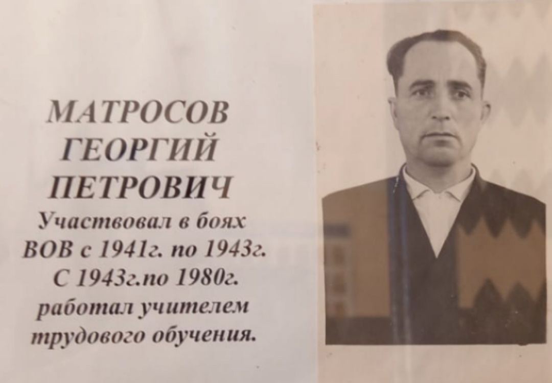 Матросов Георгий Петрович родился в 1922 году в Билярске. Был призван в Рабоче-крестьянскую Красную Армию в 1941 году Билярским военкоматом. В августе 1942 года был ранен осколком авиабомбы, долго лечился и был комиссован.
