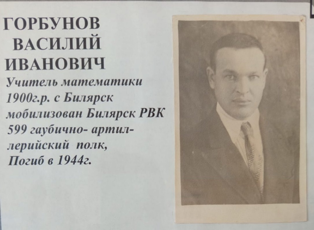 Горбунов Василий Иванович работал в Билярской школе в начале Великой Отечественной войны учителем математики. Он родился в Билярске в 1900 году. После призыва на фронт Билярским РВК, вовал в 599 гаучично- артелерийском полку. Погиб сражаясь за Родину в 1944 году.