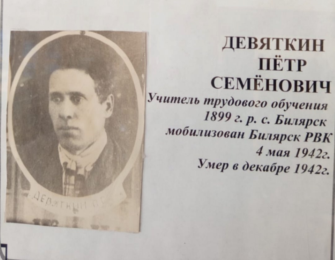 Учителем труда работал в нашей школе Девяткин Петр Семёнович. Он был коренным билярцем 1899 года рождения. 4 мая 1942 пришла его очередь встать на защиту Отечества. Воевал он в автороте в составе 226-й стрелковой дивизии в звании красноармейца. Он умер от ран в декабре 1942 года.