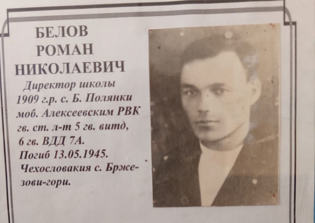 Белов Роман Николаевич был директором школы и учителем русского языка и литературы. Родился в селе Большие Полянки в 1909 году. Образование получил в Казанском педагогическом институте. Вел активную общественную работу , был депутатом районного Совета депутатов. Был призван на фронт в самом начале войны. Воевал в 6 Гвардейской воздушно- десантной дивизии. Погиб освобождая Чехословакию в мае 1945 года.