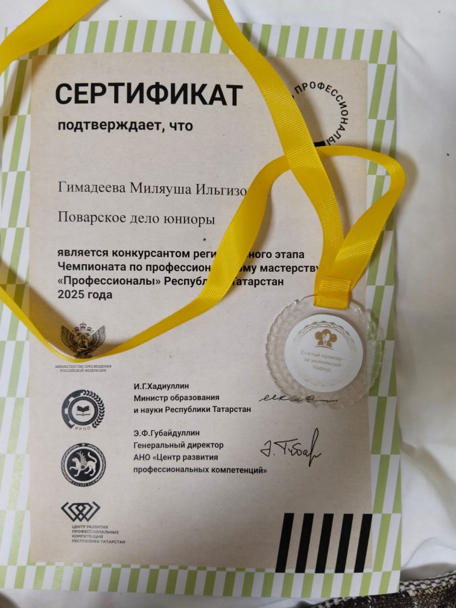 Поздравляем Гимадееву Миляушу и её педагога-наставника Елдашеву Надежду Ивановну с прекрасным результатом и отличным завершением испытаний в номинации поварское дело на региональном этапе Чемпионата по профессиональному мастерству "Профессионалы" Республики Татарстан 2025 года, который состоялся в период с 24 по 27 февраля в г. Казани. Молодцы! Вы гордость школы