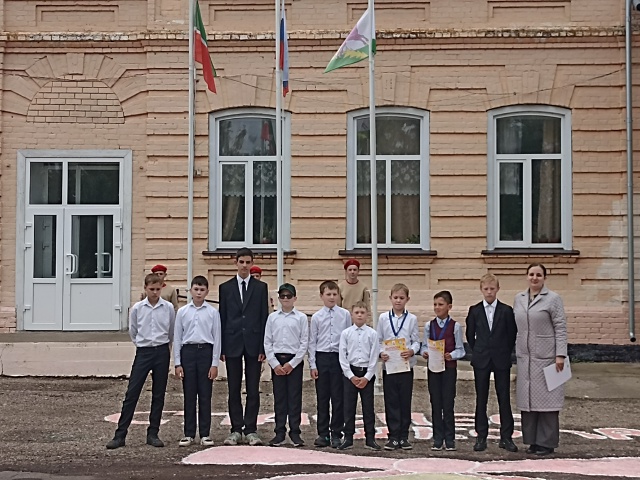 Сегодня, после исполнения гимнов и поднятия флагов, директор Билярской школы Климова М. А. поздравил ребят за активное участие в конкурсах, а также