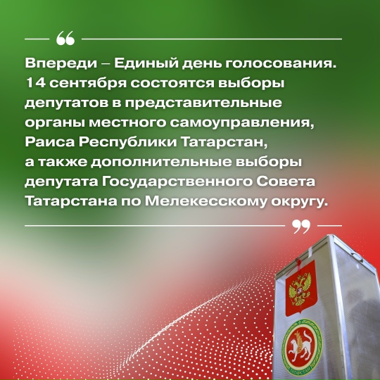 Бу якшәмбедә, 14 сентябрьдә, Бердәм тавыш бирү көне узачак. Без Татарстан Республикасы рәисен һәм муниципаль депутатларны сайлаячакбыз. Сайлау участоклары 7:00 дән 20:00 гә кадәр эшләячәк. Гаиләгез белән килегез, өлкән буынны китерегез. Безнең һәрберебезгә һәм Татарстанның киләчәгенә кагылышлы мөһим вакыйгалардан читтә калмагыз Сайлаулар алдыннан халыкка республика рәисе Рөстәм Нургали улы Миңнеханов мөрәҗәгать итте. Ул һәркемне сайлау участокларына килергә чакырды. Карточкаларда аның мөрәҗәгатенең иң әһәмиятле әйберләрен җыйдылар. Укыгыз, якыннарыгызга һәм дусларыгызга җибәрегез. Барыгызны да 14 сентябрьдә сайлауларда көтәбез! Голос Тавыш Бир, Татарстан! Татарстанны Сайла!