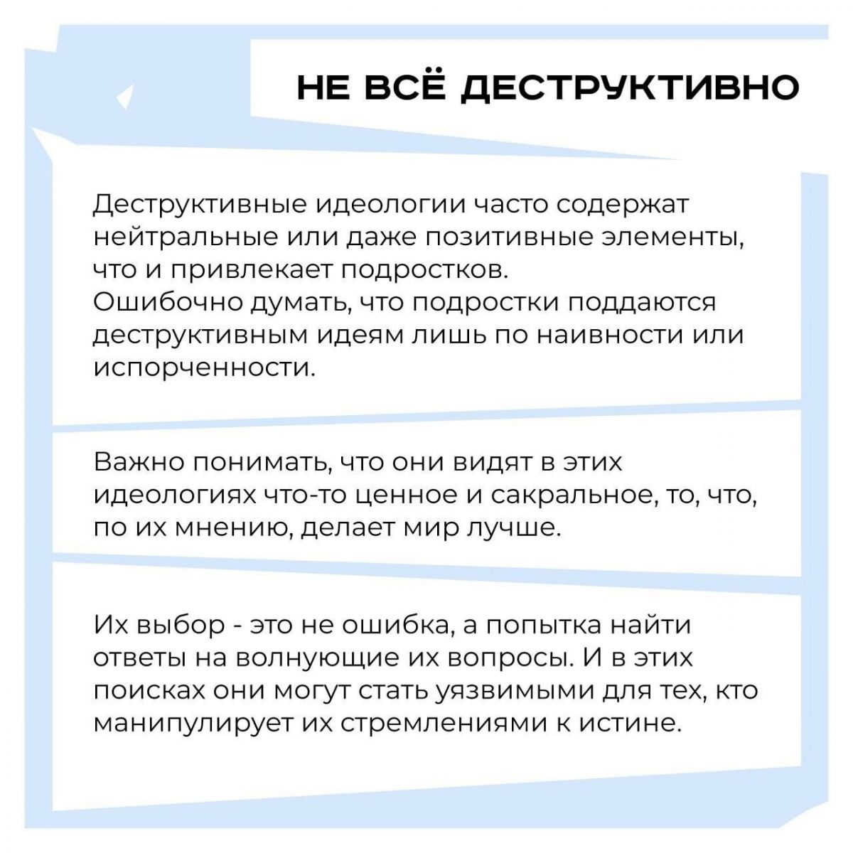 Подписывайтесь на канал Родителям о важном! (t.me/secureyour...) для рекомендаций по профилактике радикализма среди молодежи и других актуальных тем.Деструктив идеология-ул үзендә җимергеч нәтиҗәләр китерә торган кыйммәтләр системасы. Гадәттә ул гаделлек яки җәмгыятьтә үзгәрешләр идеяләре белән кешеләрне үзенә тарта. Яшүсмерләр арасында деструктив идеологияләрне нәтиҗәле профилактикалау өчен комплекслы якын килү мөһим, барысы да беренче карашка тоелганча ук гади түгел бит. Бу язмада сезгә бу күренешнең төп, ләкин кайчак сизелми торган аспектларының берничә мисалын китерик. ___ Күбрәк файдалы материаллар Мөһим нәрсәләр турында әти-әниләрегезгә каналга язылыгыз! (t.me/secureyour...) яшьләр арасында радикализмны профилактикалау буенча киңәшләр һәм башка актуаль темалар өчен.