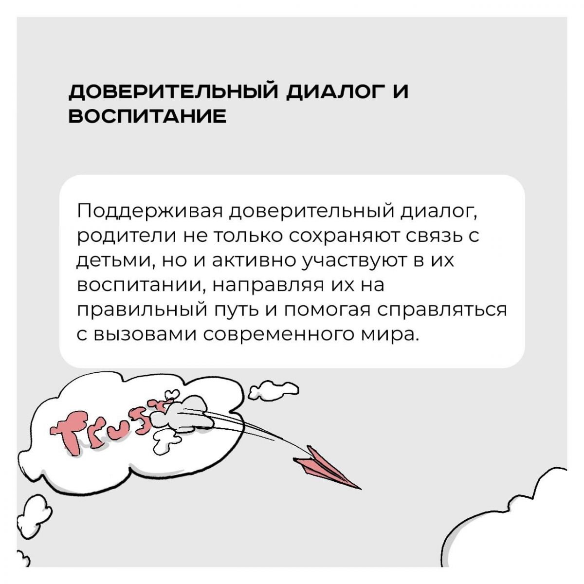 Родители, как правило, стремятся к тому, чтобы ребенок открыто делился своими мыслями которые, формируют его личность.Такие связи создают атмосферу безопасности и поддержки, что особенно важно в подростковом возрасте, когда молодежь ищет свое место в обществе.В условиях, когда радикальные идеи могут легко проникать в умы подростков, доверительный диалог становится ключевым элементом, позволяющим обсуждать сложные темы, выявлять тревожные изменения в поведении и противостоять возможному влиянию экстремистских взглядов.