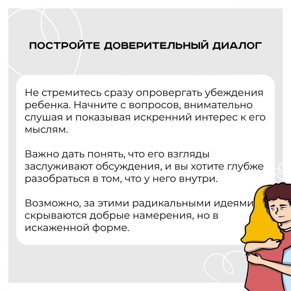 Если вы заметили, что ваш ребенок увлекся радикальными идеями, важно действовать осознанно и аккуратно.Человеческий мозг склонен упрощать сложные проблемы, что порой приводит к радикализации. Но этот процесс важно признать и преодолеть.Предлагаем несколько советов, как действовать в случае радикализации вашего воспитанника:
