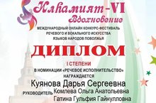 Воспитанница подготовительной к школе группы нашего детского сада Куянова Д. заняла 1 место в Международном онлайн конкурсе-фестивале речевого и вокального искусства языков народов Поволжья «ИЛҺАМИЯТ VI – ВДОХНОВЕНИЕ» в номинации "Речевое искусство". Руководители, Комлева О.А. и Гатина Г.Г.. Поздравляем!