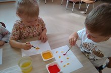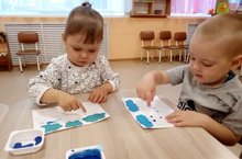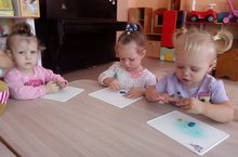 На занятии по рисованию дети учились аккуратно переносить краску на лист бумаги, примакивая по всему листу пальчиком и, оставляя "следы от дождя".