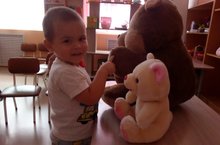 В рамках тематической недели "Наши игры и игрушки" дети рассматривали большого и маленького мишек. Малыши учились описвать игрушку (называть части, величину, признаки), сравнивать большую и маленькую игрушку.