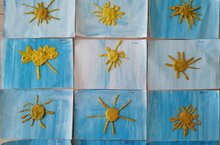 На занятии воспитатель побеседовалас детьми о наступающем времени года «Лето». Поговорили, какое бывает летом солнышко. А затем предложила детям слепить его. Прежде чем начать работу, провели пальчиковую гимнастику по теме «Солнышко». Дети были очень увлечены, у каждого из них получилось своё красивое солнышко.