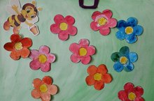 Воспитатель использовала на занятии нетрадиционную технику рисования губкой. Изготовив свои цветы, дети разместили их на зелёной поляне для пчёлки.