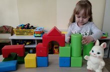 На занятии дети продолжили знакомиться с понятием «большой» и «маленький», узнали, из какого материала сделаны большие и маленькие кубики (пластмасс и дерево). Дети построили большой домик для большого зайчика и маленький дом для маленького зайчика. На следующий день во второй половине дня закрепили эти понятия с помощью палочек Тепляковой О.Н., т.е. на плоской поверхности также дети строили домики для большого и маленького зайчика.
