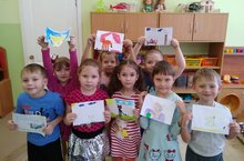 Воспитатель закрепляла с детьми приёмы вырезывания и аккуратного наклеивания.