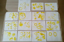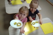Дети познакомились с народной игрушкой «Петрушкой», рассмотрели какой формы бывают бублики. Предварительно перед рисованием краской на листочках, учились: во-первых обводили пальчиком в воздухе рисовали круг, во-вторых сухим ворсом кисти обводили на готовых формах (картонные бублики) учились замыкать круг, а затем рисовали краской.
