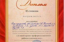 Подведены итоги муниципального этапа Республиканского конкурса "Лучший проект профориентационной работы в детском саду". Наш коллектив в под руководством старшего воспитателя Имамутдиновой Надежды Равильевны и творческой группы воспитателей: Сарбаевой Светланы Николаевны, Фатыховой Ляли Нургалиевны, Комлевой Ольги Анатольевны, Сергевниной Светланы Владимировны, Сурковой Марины Геннадьевны и Козловой Светланы Владимировны занял 2 призовое место в номинации "Все профессии нужны, все профессии важны. Поздравляем и желаем дальнейших успехов!