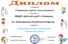 Воспитанница нашего детского сада Арина Г. (татарская группа, воспитатель Савинова Г.А.) приняла участие во Всероссийском конкурсе творческих работ "Здоровм быть здорово!" и заслужила диплом лауреата. Так держать, Ариша!!!